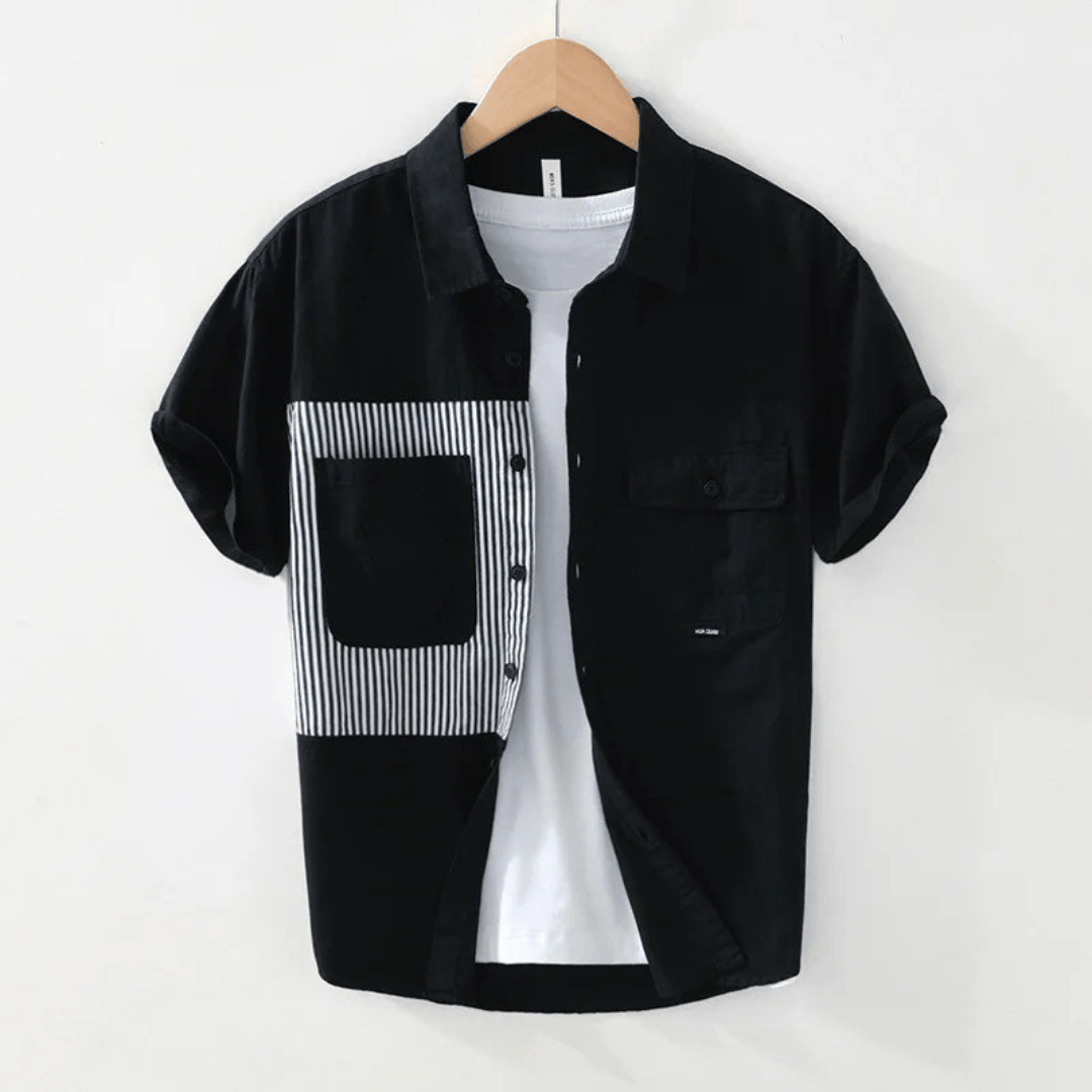 Detailed with a bold vertical pinstripe panel and dual chest pockets, this piece balances structure with flow - ideal for summer days that move from street to shoreline.
