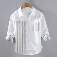 Crafted from ultra-soft cotton, our Asher Shirt blends coastal charm with a touch of modern design. The seafoam blue body contrasts with vertical striped panels and a matching striped chest pocket, creating an easygoing yet refined look.