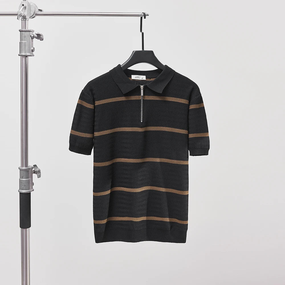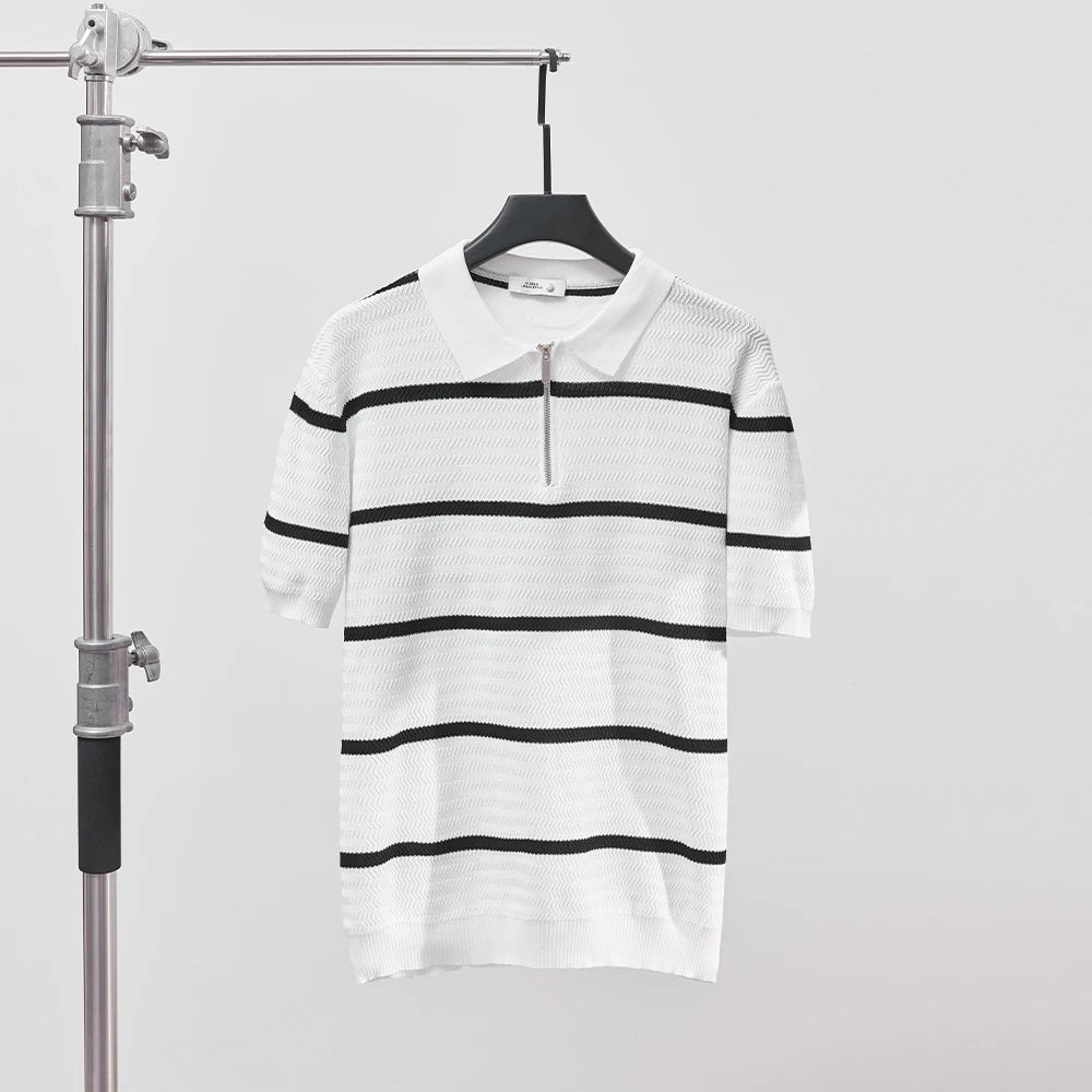 Crafted from ultra soft, lightweight cotton, our best selling Damasco Polo brings sharp lines and elevated ease to warm-weather dressing. With its structured zip collar, wide stripe pattern, and tailored fit, it carries the kind of quiet confidence made for long city days and after-dark plans.