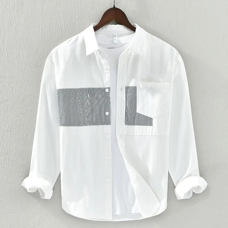 Crafted from breathable cotton with a crisp, structured finish, our Lenoir Shirt is a contemporary twist on the classic button-down. A tonal panel of pinstripe contrast adds quiet character, while the relaxed fit and soft collar lend effortless charm. Designed for the discerning minimalist, it’s a piece that speaks without shouting.