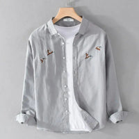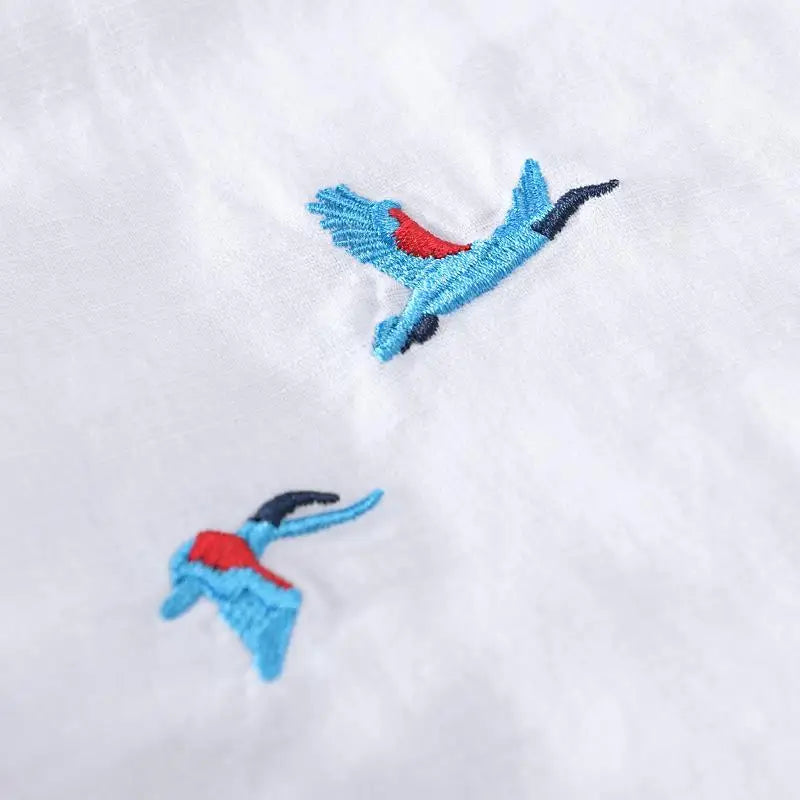 Crafted from a breathable linen blend, the Montana Shirt showcases intricate embroidered bird motifs for a subtle yet distinctive look. Its relaxed fit and classic design make it perfect for layering or wearing solo.