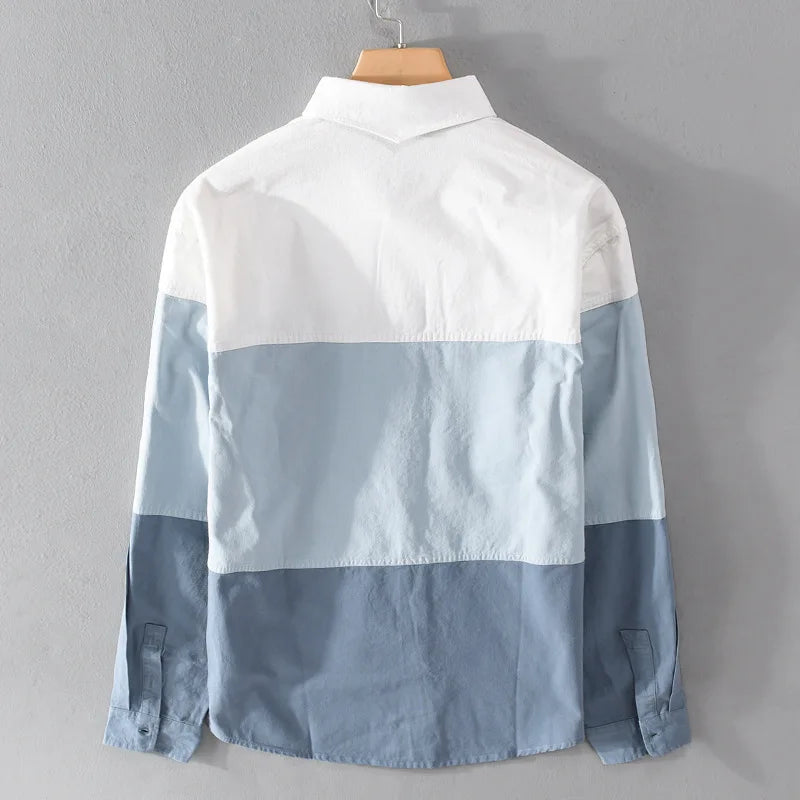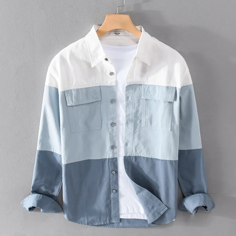 Crafted from breathable midweight cotton, our best selling Salvo Shirt brings a bolder edge to everyday wear. With layered panels of crisp white, soft blue, and steel grey, it’s designed to make a quiet statement - structured, cool, and unapologetically sharp.